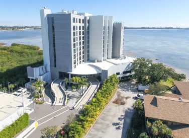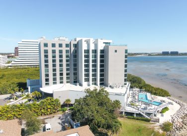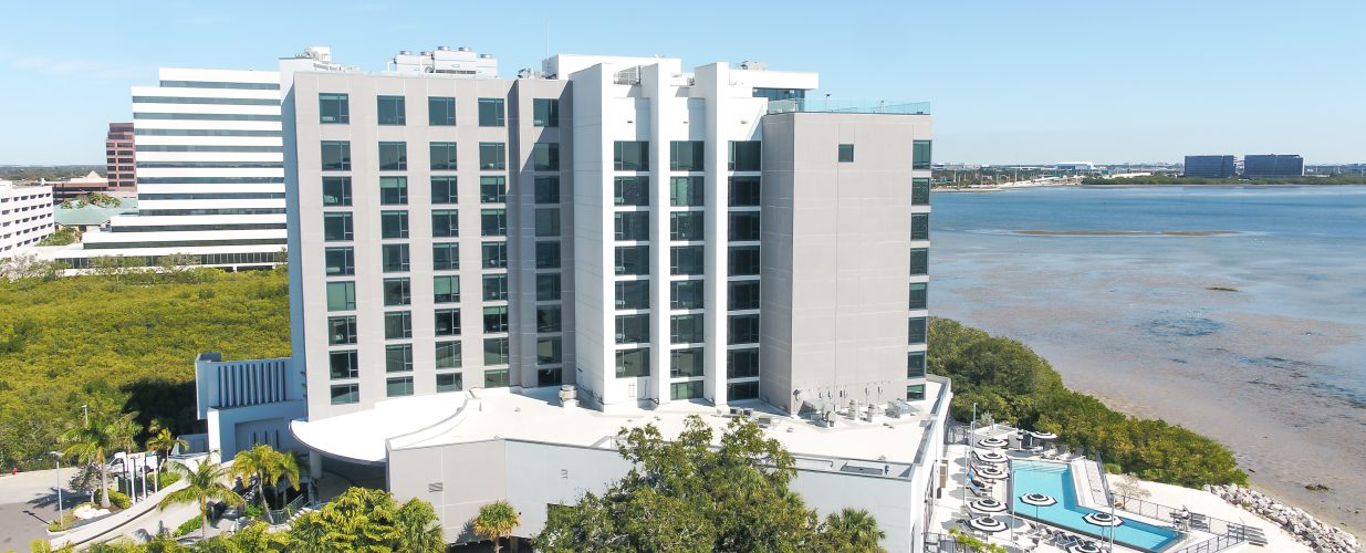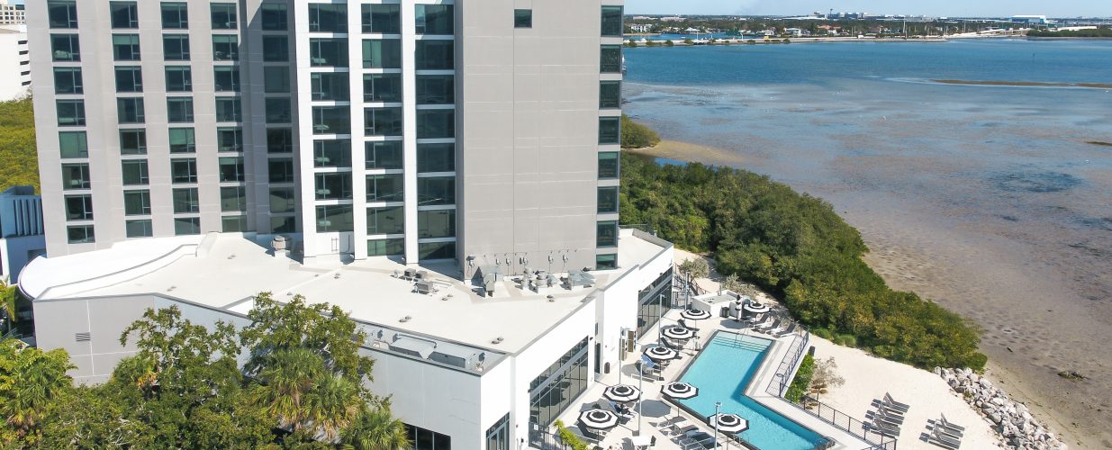 Wide aerial view of the Current Hotel next to the Tampa Bay